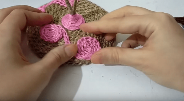 Соединяем ручку и крышку и можно переходить к декору. Например, его можно сделать в виде какого-либо узора из джутовой нити другого цвета.