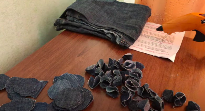Чтобы легче было сделать заготовки, подготовим для них трафарет. В нашем случае это вот такой небольшой кружок из картона, его диаметр — 5 см. Затем, пользуясь этим трафаретом, вырезаем как можно больше кружков из выбранной ткани. В нашем случае это старые джинсы.