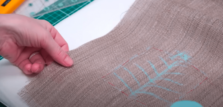 Дальше займемся вышивкой. Для этого намечаем канву и наносим схему для вышивки, например, с помощью мелка. В нашем случае это вот такая елочка. С изнаночной стороны закрепляем отрывной стабилизатор.