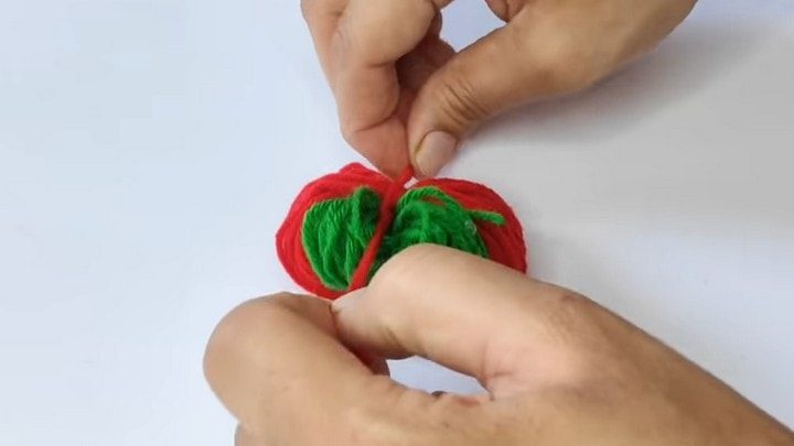Придайте помпону форму: красную часть подстригите в виде конуса, имитирующего ягоду. Зелёной части придайте форму листиков.