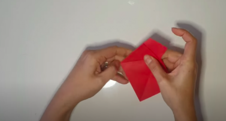 Подготовительный этап может показаться кому-то не совсем простым, но здесь необходимо лишь «набить руку». Поэтому не боимся и подготавливаем квадрат из бумаги, затем складываем его пополам так, чтобы получился треугольник. Хорошо проглаживаем сгиб, затем раскрываем треугольник и вновь складываем квадрат пополам, но уже в прямоугольник.