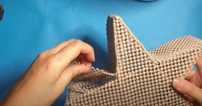 Когда каркас будущего ночника готов, его можно перетянуть. Для перетяжки можно использовать различные материалы, например, мешковину или даже ячеистый коврик для сушки посуды. Выбранный материал наклеиваем на лицевую сторону каркаса, лишнее обрезаем, оставляя небольшой запас, буквально 0,5 — 1 см. То же самое проделываем и со второй стороной каркаса.