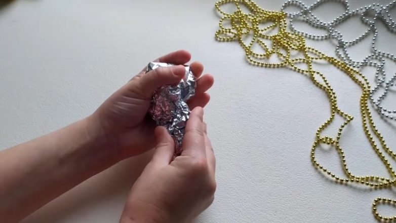 Теперь приклейте у основания верёвку, а вторым рядом возле неё — бусы. Начните оборачивать ими фольгу, добавляя горячий клей по ходу работы.