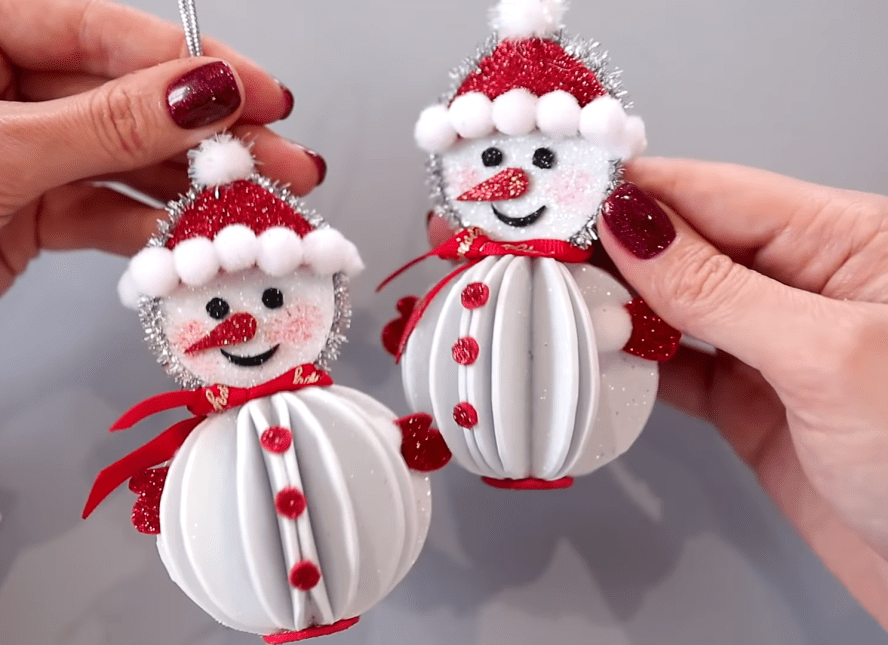 Дополняем нижний ком декоративной подставкой, сверху приклеиваем голову, На стыке повязываем шарфик из узкой ленты. По одному из ребер нижнего кома пускаем ряд пуговиц, с боков приклеиваем варежки, дополняем их опушкой из помпонов. Еще один помпон наклеиваем на шапку при необходимости дополняем его подвесом.