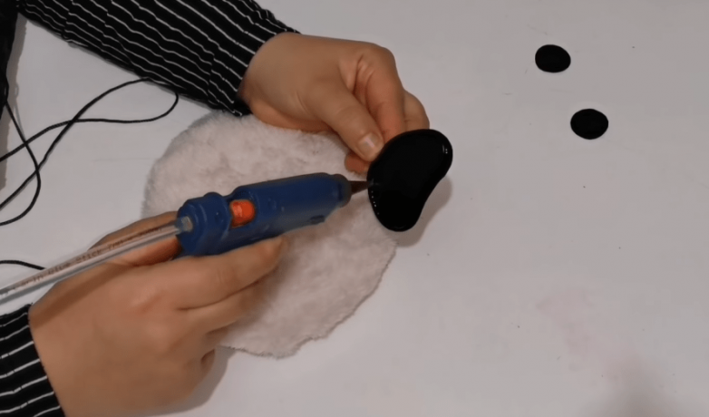 Наклеиваем нос, собираем рот с языком в единое целое, прокладываем между носом и ртом перемычку из черной пряжи. При отсутствии таковой используем обычные нитки, предварительно скрутив их в жгутик. Присоединяем нижнюю часть мордочки к основанию, а затем приклеиваем глазки.