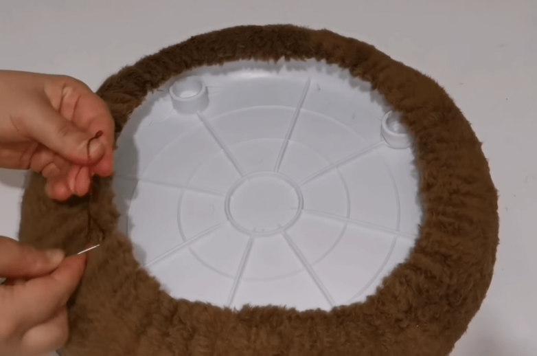 Для обивки используем кусок коричневой ткани. Шаблоном выступает все та же сидушка, но теперь уже с учетом обивки. Ткань вырезаем с учетом припусков и подгиба. Крепкой нитью прокладываем по периметру наметочный шов, а затем, надев чехол на сидение, окончательно затягиваем его.