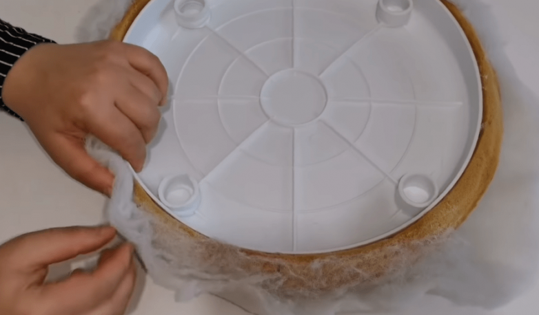 Следующий слой делаем из остатков синтепона. Важно, чтобы при работе излишки наполнителя случайно не попали в пазы для ножек.