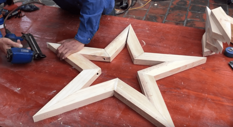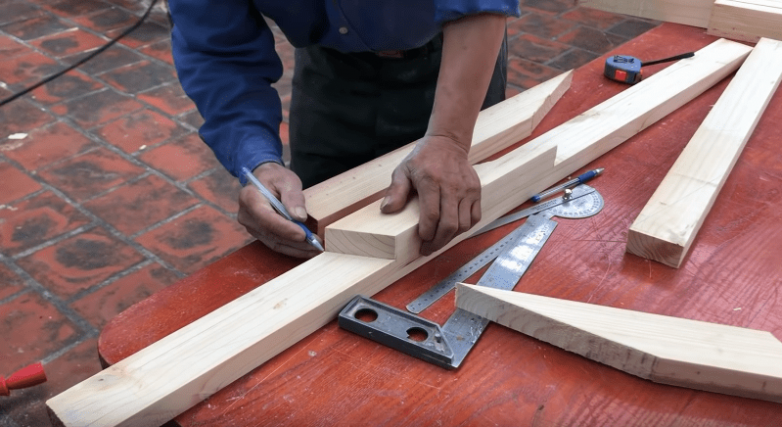 Углы выбираем, исходя из того, что нарезанные доски должны собираться в звезду. Также при подборе угла учитываем положение спинки скамьи: хотите ли вы, чтобы она была ровной или все же немного откинутой. Чтобы облегчить себе задачу, стоит нарисовать схему. Готовые заготовки собираем в звезды и фиксируем при помощи клея, гвоздей и саморезов.