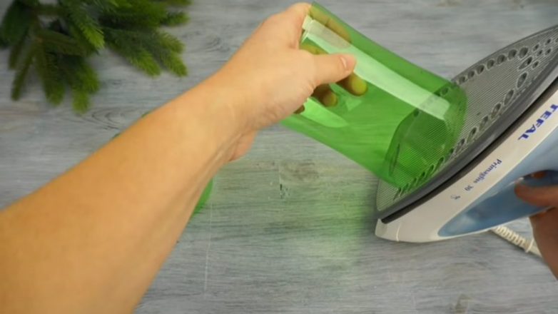 Бутылку разрежьте на три части: отрежьте верх и донышко. Основная часть, соответственно, самая длинная. Верх с пробкой не понадобится. У двух оставшихся деталей закруглите края с помощью утюга.
