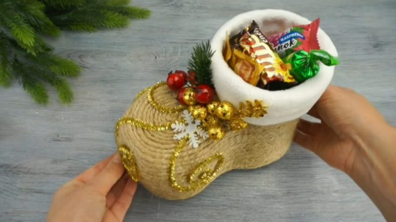 Осталось только наполнить сапожок конфетами, и чудесный подарок к Новому году готов!