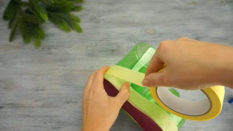 Горячим клеем приклейте дно и основание пластиковой бутылки к картону. Оклейте вокруг со всех сторон малярным скотчем.