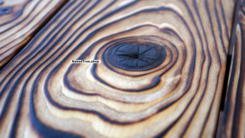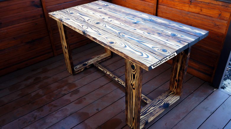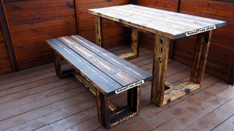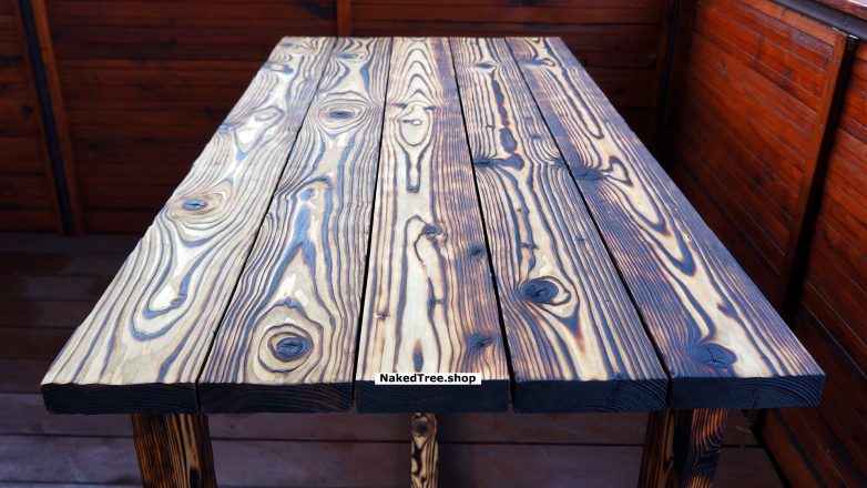 Обожжён, браширован и покрыт натуральным маслом с воском. Имеет уникальный внешний вид. Настоящий кайф сидеть в беседке за таким столом!
