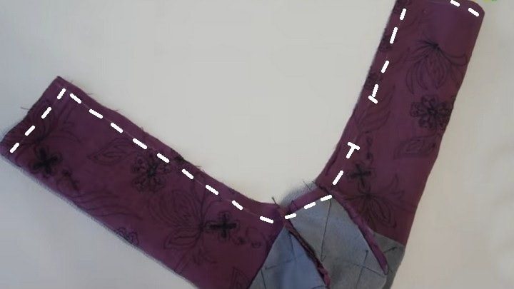 Подобным образом прокладываем швы и на противоположной стороне. После этого складываем заготовку вдоль пополам и прокладываем шов по открытому краю, оставляя небольшое отверстие для выворачивания. Кстати, если вы шьёте из палантина, на концах которого — кисти, их можно сохранить. Тогда шов нужно будет проложить только по длинному открытому краю, а изделие вывернется через одно из боковых отверстий, на которых будут кисти.