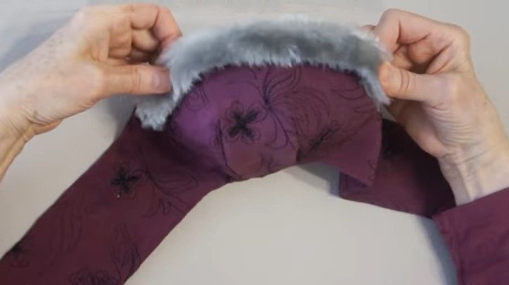 После этого изделие нужно вывернуть, отгладить, вручную зашить отверстие для выворачивания. Далее на центральную часть по краю пришивается мех.