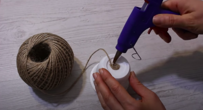 Далее берем бельевую веревку белого цвета или другой сходный материал и начинаем оплетать шарики, фиксируя веревочку с помощью клея. В начале и в конце оплетки веревочку заворачиваем «улиткой».