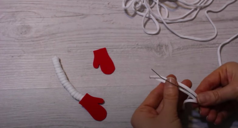 Теперь подготовим ручки. Для этого из красного войлока или фоамирана вырезаем рукавички. Далее берем небольшой отрезок проволоки и оплетаем его бельевой веревкой. Удобнее всего это сделать следующим образом: берем 3 отрезка веревки и приклеиваем их в начало проволоки «пучком» так, чтобы они покрывали проволоку. Затем берем еще один отрезок веревки и обвязываем получившуюся конструкцию по спирали. Фиксируем все с помощью клея. Не забываем приклеить и варежки.