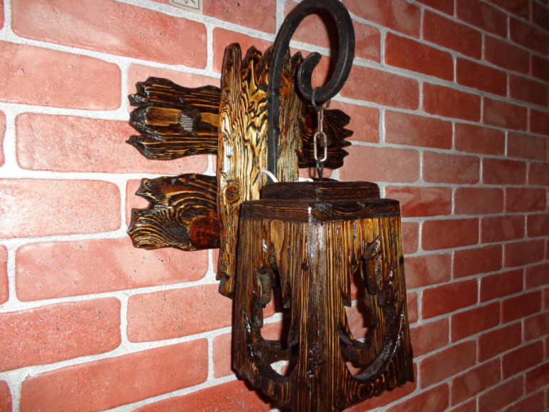 Сложный вариант — попробовать сделать его самостоятельно. Вначале нужно определиться, из какого материала будет сделано изделие. Если из дерева, так же можно упростить задачу — использовать готовую деревянную модель, продающуюся в наборах. Далее задекорировать ее по желанию, добавить стекла или пластик. Использовать провод, свечу, керосин или же лед-светильник. Но, конечно, в случае с огнеопасными материалами, лучше делать дополнительный источник, чтобы деревянная конструкция не загорелась.