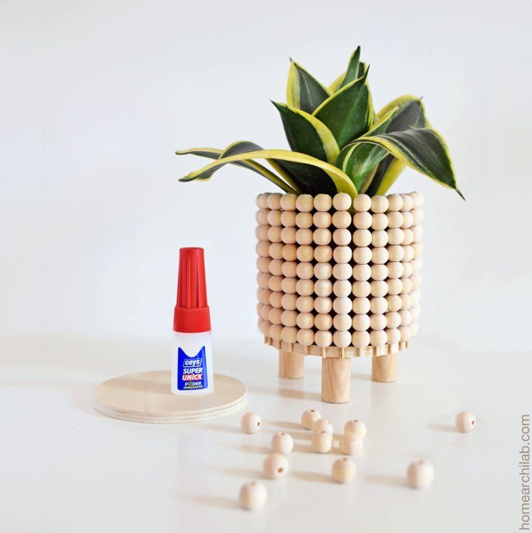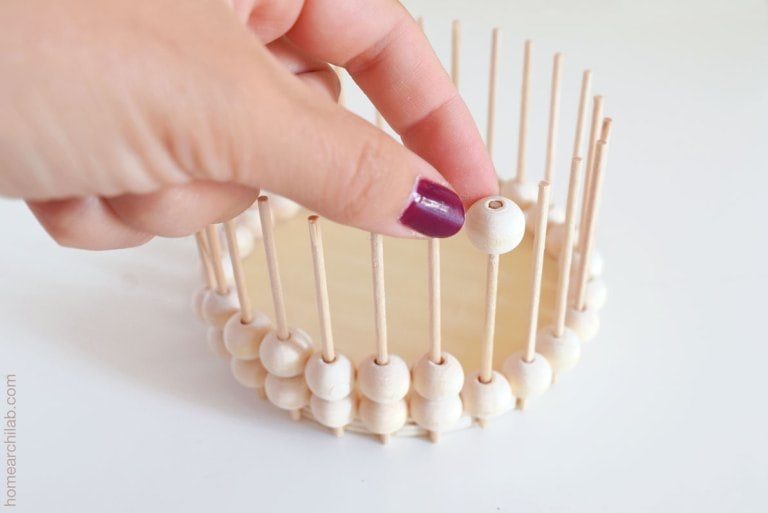 Процесс создания горшка очень прост. Приклейте шпажки к деревянному основанию по кругу. Расстояние межу шпажками должно быть таким, чтобы бусины каждого ряда соприкасались друг с другом.