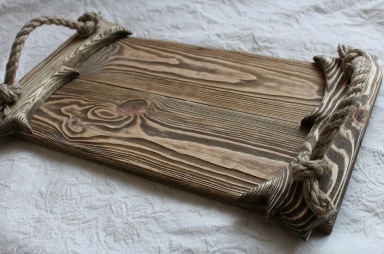Для ценителей эко-минимализма, понравится изделие из дощечек. Просто подберите по размеру пару досок и соедините их клеем или просто гвоздями.Если будет возможность, сначала их необходимо окрасить, но и в естественном облике поднос выглядит очень интересно. Главное, приделать рукояти для практичности.