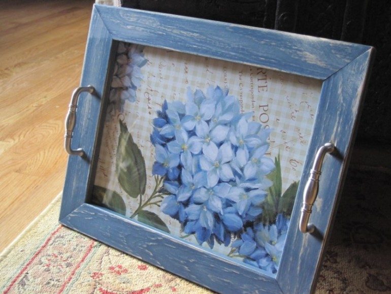 Еще одна занимательная идея – смастерить поднос из рамы испорченной картины, которая будет смотреться просто чудесно. Для этого нам понадобится некоторые вещи: ткань; морилка, лак; кисть, стекло, витражные рукояти, горячий клей, картинная рама.