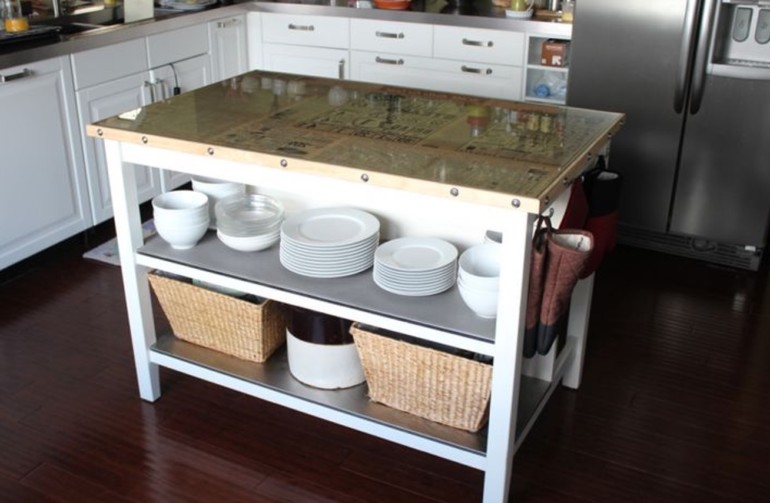 Если необходимо создать маленький передвижной кухонный остров, то можно просто закрепить сверху на шкафу столешницу и прикрутить снизу ножки, благодаря которым конструкция сможет перемещаться. В шкафу можно также использовать открытую систему хранения, которая не подразумевает дверцы или ящики.