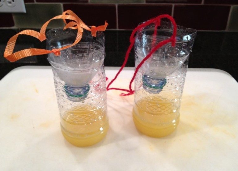 Вот и все, теперь можно переходить к созданию ловушек. Сначала нужно обрезать у пластиковых бутылок верхнюю часть. Крышки предварительно убрать, а внутрь основной части налить сироп. В качестве приманки можно использовать и обычный сок.