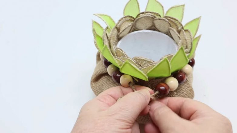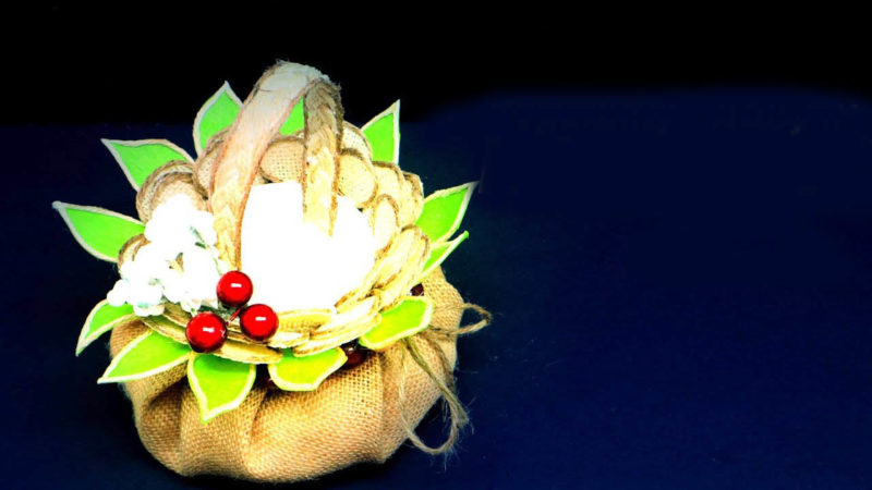 К внутренней части на горячий клей приклеиваем косичку, сделанную из джута. Можно добавить любой другой декор. Расправьте лепестки и листья — они уже достаточно подсохли. Получилась симпатичная корзинка-цветок!