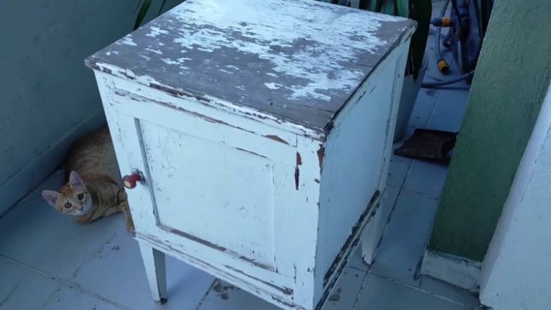 Перед покраской мужчина зашкурил и загрунтовал в некоторых местах тумбочку, чтобы поверхность была максимально ровной. Нанёс в три слоя краску красивого пастельного оттенка. После просушки собрал все элементы воедино.