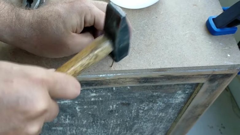 Первым делом мастер отсоединил детали тумбочки, которые держались на гвоздях или мебельных уголках.