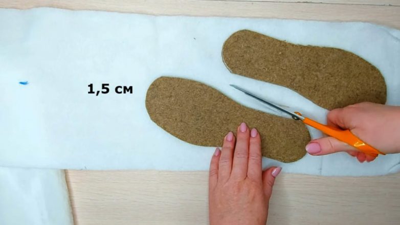 Заранее купите стельки вашего размера (можно подрезать ножницами до идеального размера). Также понадобится кусок меха или любого другого мягкого материала, размером примерно 20х70 см и синтепон. Необходимо приложить стельки к материалу и вырезать с добавлением 1,5 см вокруг стельки.