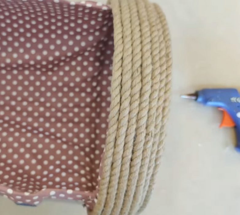 Приклейте крышку ко дну. С помощью горячего клея зафиксируйте на крышке канат и начните приклеивать его по спирали.