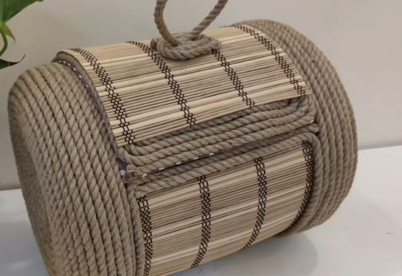 Края крышки обклейте канатом: сделайте 3 оборота. Сверху на канате закрепите бамбуковый коврик. В качестве ручки выступит петелька, сделанная из каната. Ее необходимо приклеить к крышке.