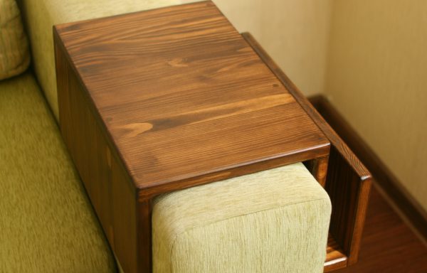 Сам процесс изготовления крайне прост, но есть некоторые нюансы, которые могут испортить впечатление в конечном итоге от работы. Нужно взять несколько досок ДСП, размер которых подходил бы под облокотник дивана. В итоге с помощью шурупов и шуруповерта можно собрать нечто похожее на букву П. Это и есть столик! Можно поздравить- был собран первый столик-подставка для дивана собственными руками! Но такой столик использовать и небезопасно и он своим неприглядным внешним видом будет отпугивать всех желающих попить чайку. Дальше придется раздобыть специальную декоративную бумагу для облицовки мебели, и приклеить ее к П-образному столику для дивана.Тут нужно оговориться, то клеить стоит предельно внимательно, и не стоит упростить процесс поклейки, так как это скорее всего приведет к браку. Аккуратно наклеив декоративную бумагу, имитирующую живой рисунок древесины, стоит покрыть столик лаком. Тут стоит оговориться- придется постараться и одним слоем не обойтись, так как столик сможет изменить свой привлекательный лакированный внешний вид на неприглядный очень просто после того, как на него неоднократно будет проливаться чай или любые жидкости.