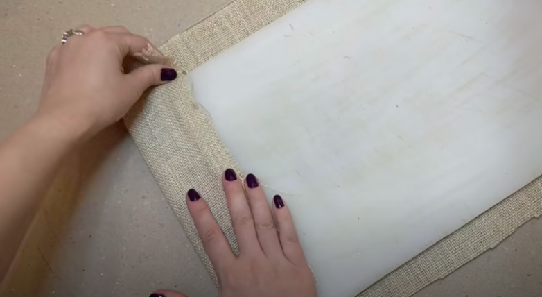 Разделочная доска в данном случае будет выполнять роль задней стенки органайзера. Но для начала ее нужно немного облагородить, например, перетянуть тканью. Отлично для этого подойдет мешковина, ее просто приклеиваем к доске. Если на заднюю стенку доски ткани не хватило, ничего страшного.