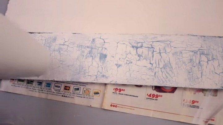 Переворачиваем поднос и начинаем творить. Всю поверхность можно сделать в едином стиле, или, как в этом варианте, каждую из дощечек оформить по-разному. Чтобы придать поверхности эффект состаренности, покрасьте поверхность в яркий или темный цвет. Дайте краске высохнуть, а затем вертикальными и горизонтальными мазками нанесите клей ПВА. Пока клей ещё не высох сверху намажьте слой белой акриловой краски. Теперь возьмите фен и направьте на поверхность струю горячего воздуха. По мере высыхания клей с краской будут растрескиваться и появятся трещинки, через которые будет видна цветная основа.