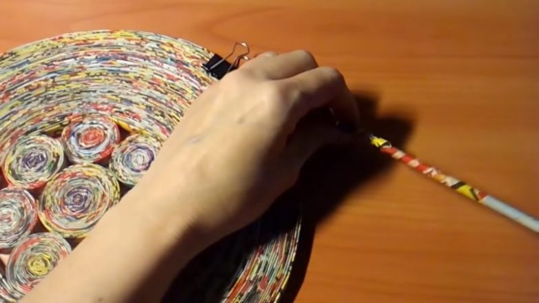 Теперь приклейте трубочку вокруг получившейся заготовки и начните оборачивать трубочками, не используя клей ПВА. Используйте зажим для более комфортной и простой работы. Вы должны продолжать скручивать до тех пор, пока не достигнете диаметра 25,5 см.