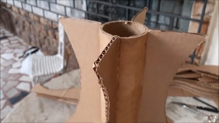 Для проекта вам понадобится плотная картонная втулка длиной 54 см, а также шаблоны из картонных ящиков. Формой шаблоны напоминают половину древнегреческой амфоры. Основание одной такой заготовки — 6, 5 см, затем идёт расширение до 14, 5 см, затем сужение до 3 см, и вновь небольшое расширение до 5, 5 см. Высота, как и у втулки, — 54 см.