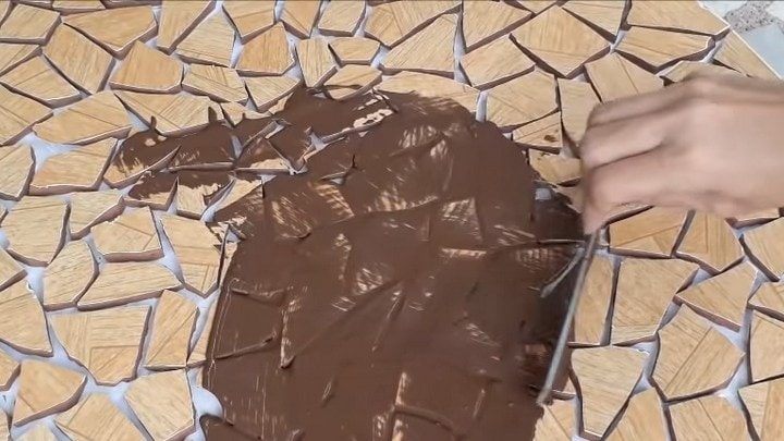 Для украшения столешницы используйте битый кафель. Повреждённые плитки строительные магазины часто просто выбрасывают, так что раздобыть этот материал можно совершенно бесплатно. Аккуратно разбейте кафель на кусочки желаемой величины. Наклейте на поверхность, а промежутки замажьте с помощью затирки. Через пару часов, когда затирка «схватится», протрите поверхность влажной тканью, чтобы очистить кафель.