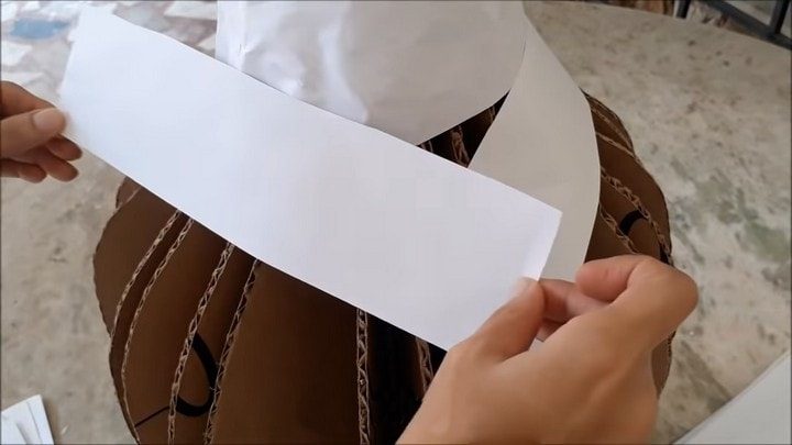 Теперь из картонных ящиков необходимо вырезать столешницу. Ориентируйтесь на необходимый вам размер, здесь же её диаметр равен 55 см. Чтобы столешница получилась прочной, понадобится как минимум 7 слоёв картона, тщательно под гнётом склеенных друг с другом. С помощью ножа или крупной наждачной бумаги выровняйте срез, а затем, чтобы окончательно сгладить, заклейте его кусочками бумаги.