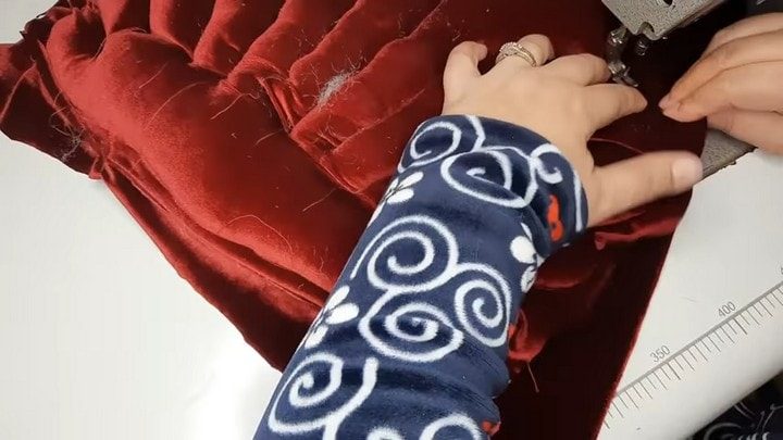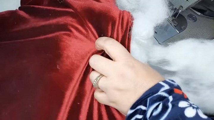 Вам понадобятся: бархат стрейч — 3 отрезка 40 на 41 см, тонкий дублерин такого же размера — всего один кусок, любой наполнитель типа холлофайбера, нитки в тон, ножницы и швейная машина.