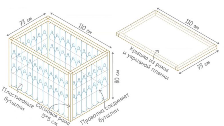 Простой чертеж мини-теплицы можно найти ниже. Она состоит, прежде всего, из основания — короба, сделанного из рамы (сосновые доски), пространство между которыми заполнено пластиковыми бутылками, скрепленными проволокой. Крышка сделана из тех же досок, а сверху — укрывная плёнка.