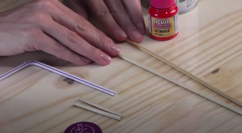 Для того чтобы создать ось тележки. коктейльную трубочку подрезаем: нам необходима лишь небольшая центральная часть. Далее длинные деревянные шпажки вставляем в обрезанную трубочку с одного и с другого конца, фиксируем их с помощью клея. Получившуюся заготовку покрываем краской, также как и заготовки для ножек и колеса.