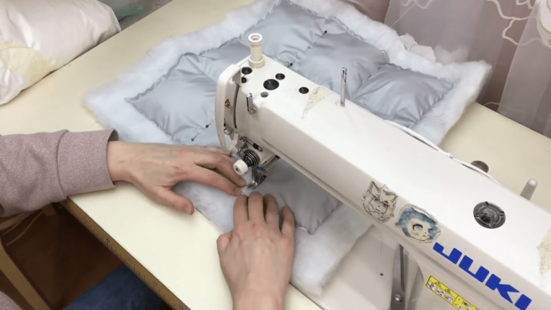 Начинаем с прошивки стеганых деталей. Прокладывать швы здесь нужно постепенно. Важно обеспечить доступ к каждому из отсеков. Отсеки набиваются поочередно, а затем застрачиваются по мере наполнения. При работе важно следить за тем, чтобы набивка не попадала в швы.
