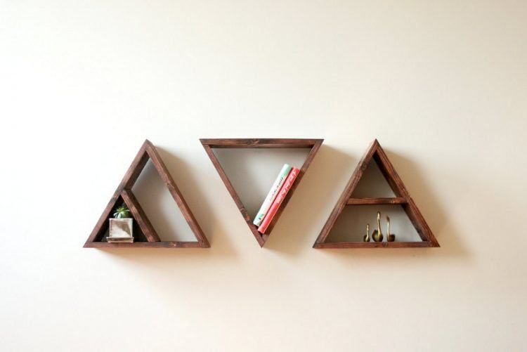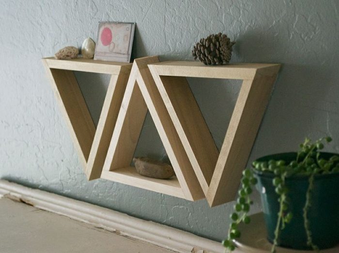 Первое, что требуется сделать практически в любой работе – это составить план или эскиз конструкции. Важно точно вымерить каждую деталь, чтобы при сборке они точно подошли. Какой будет полочка зависит от фантазии мастера. Это может быть одинарный треугольник или несколько изделий объединенных в одну систему.Внимание! Не стоит делать изделия слишком большими, так как крепление могут не выдержать высокие нагрузки. Если требуется разместить множество книг или цветочных горшков оптимально сделать больше полочек. Работать предстоит в следующей последовательности.