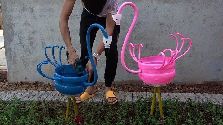 В отрезок толстого полиэтиленовый шланга (это будет шея птицы) вставляем 4 куска проволоки чуть больше по длине. Концы проволоки оставляем снаружи одного из концов шланга. В верхней части основы проплавляем или вырезаем отверстие, чтобы вставился кусок толстого ПВХ шланга. Концы проволоки крестообразно раздвигаем и крепим при помощи стяжек.