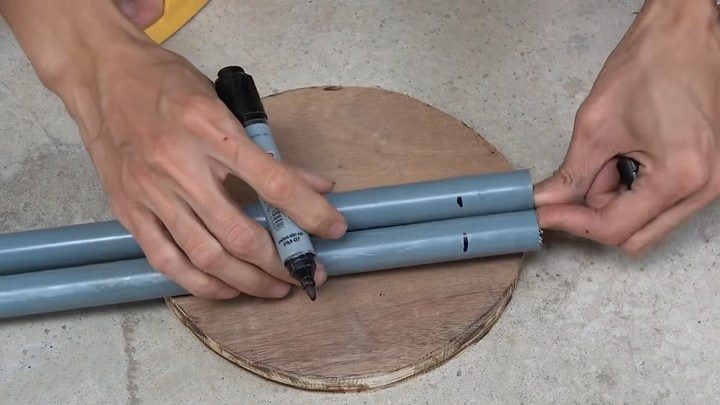 Из куске фанеры обводим дно будущего кашпо и вырезаем круг. А на концах ПВХ труб (это будут ноги фламинго) делаем на одинаковой высоте метки.
