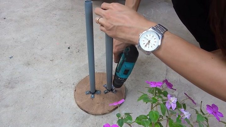 Осталось поставить сверху само кашпо и прикрутить его к основанию шурупами.