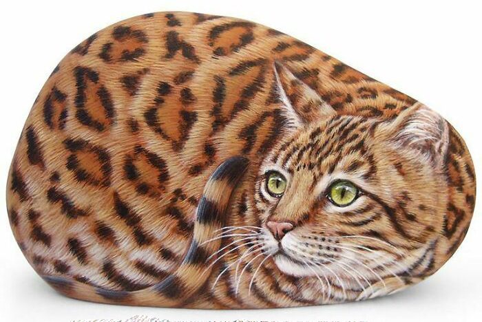 «Выбор формы камней является фундаментальным. Я провожу очень много времени, гуляя по пляжам и берегам рек, чтобы найти вдохновение и выбрать правильные камни. Когда я нахожу то, что нужно, я возвращаюсь в свою студию. Там я очищаю камень и начинаю творить. Сначала я выбираю базовый цвет для фона. После высыхания я начинаю с точной прорисовки животного. Это очень важный этап работы. Когда я доволен своим эскизом, то начинаю рисовать большие участки тела кистями среднего размера. Я медленно перехожу к мелким деталям, используя кисти для ретуширования. Чтобы закончить картину на камне среднего размера, примерно с ладонь, мне обычно требуется два-три дня работы».