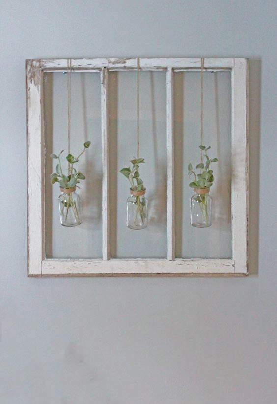 Подвесные кашпо из стеклянных бутылок, расположенных на старой оконной раме