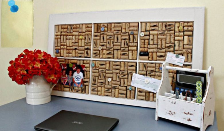 Доска из оконной рамы и винных пробок, куда можно прикреплять на кнопки важные фото или заметки